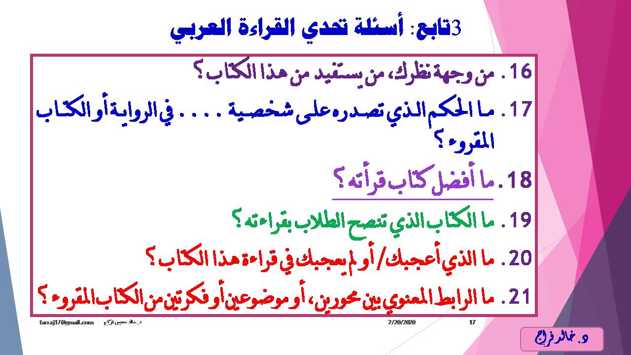 اسئلة تحدي القراءة العربي. التعريف بتحدي القراءة العربي تحدي القراءة العربي هو أكبر مشروع عربي أطلقه صاحب السمو الشيخ محمد بن راشد آل مكتوم نائب رئيس دولة الإمارات العربية المتحدة رئيس مجلس الوزراء حاكم دبي لتشجيع القراءة لدى الطلاب في. تحدي القراءة العربي مبادرة لتشجيع القراءة من يشارك في تحدي القراءة العربي التلاميذ و الطلبة ما هي الفئات. تنبيه هام لشيوخ المعاهد ومسئولي مشروع تحدي القراءة بالمعاهد الأزهرية. أ علن اليوم الثلاثاء عن اسم ممثلة المغرب في مسابقة تحدي القراءة العربي المنظمة من طرف دولة الإمارات العربية المتحدة وهي التلميذة سارة الضعيف التي تتابع دراستها بالجذع المشترك بالثانوية التأهيلية ابن سليمان.
