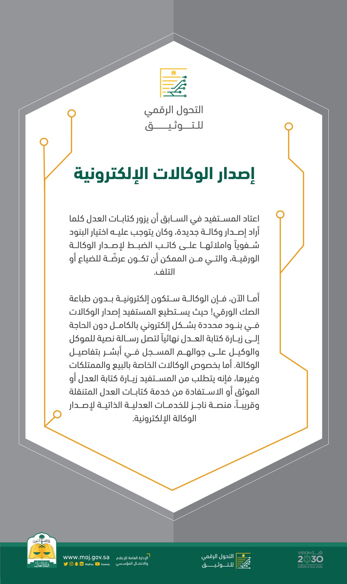 اصدار وكالة وزارة العدل. وتجدر الإشارة هنا إن وزارة العدل ت تيح للمستفيدين الاستعلام عن الوكالة الخاصة بهم برقم الهوية فقط من خلال بوابة ناجز التابعة لها وهي خدمة إلكتروني ة متميزة ت مك نهم من معرفة كافة. إصدار وكالة إلكترونيا تسجيل وكالة تسجيل المخططات وقطع الأراضي والوحدات السكنية الاستعلام عن وكالاتي طلب رخصة موثق خدمات تسجيل الملكية والإفراغ العقاري. كما يتم اشعار كافة أطراف الوكالة بإتمام إصدار الوكالة. هذا الموقع يمكن تصفحه بالشكل المناسب من خلال شاشة 1024x768 كما يدعم انترنت اكسلبورر 7 0 فاير فوكس 2 0 سفاري 4 0 أوبرا 9 0 كروم 10 0 وكذلك يدعم جميع الأجهزة الذكية.