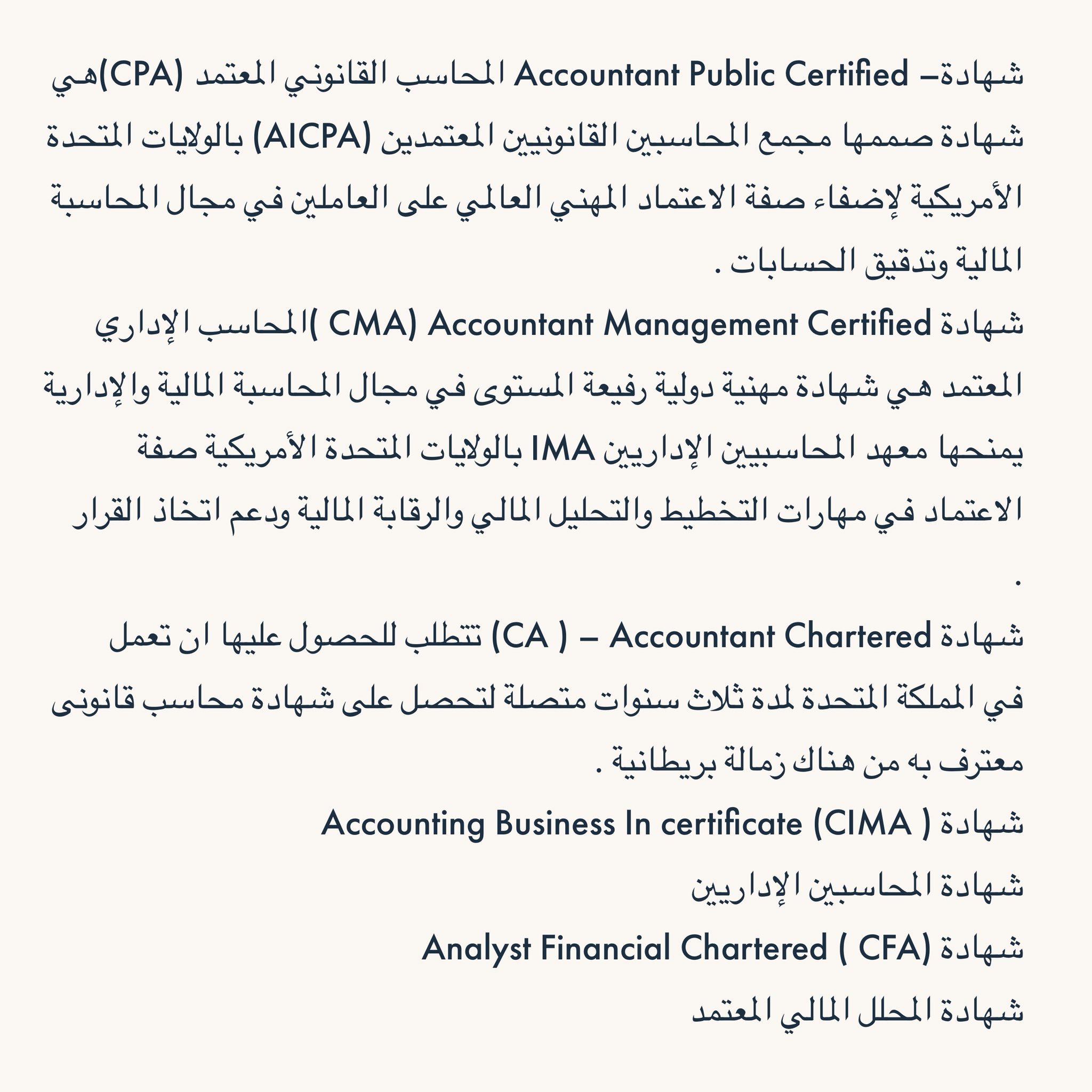 مركز الإحتراف المحاسبي للتدريب المحاسبي. قائمة ببعض الشهادات المهنية المتعلقة بالمحاسبة. نقدم دورات الزمالة السعودية في المراجعة و المحاسبة و الزكاة و الدخل بالإضافة إلى الدورات الدولية cpa و دورات محاسبية متنوعة. شهادات مهنية في المحاسبة.