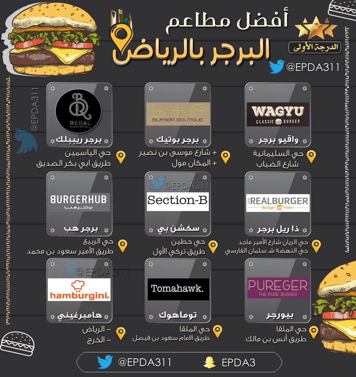 أفضل مطاعم الرياض تحت تصنيف برجر هذه قائمة بأفضل المطاعم في الرياض والتي تقع تحت تصنيف برجر.
